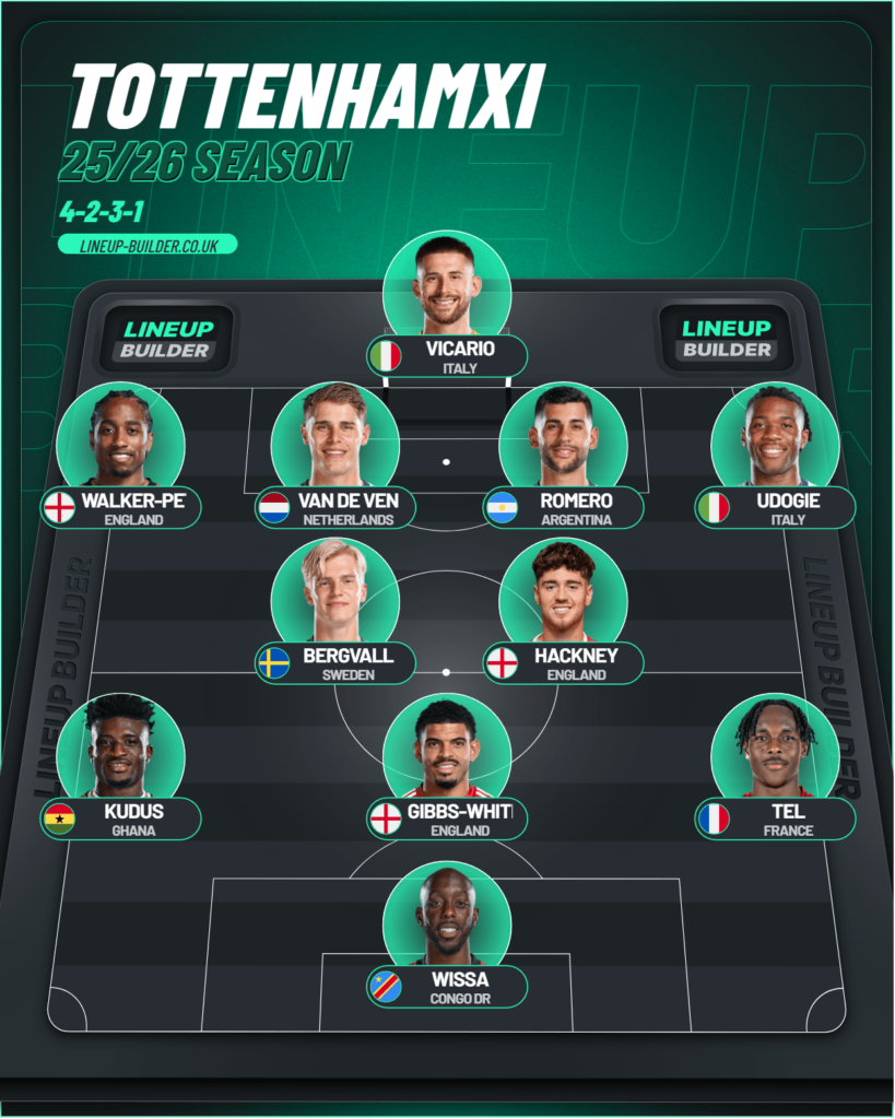 실제 '토트넘 홋스퍼 뉴스'가 공개한 예상 베스트 일레븐 명단을 보면 2선에는 텔과 깁스-화이트, 쿠두스가 자리를 잡고 있다. 최전방에는 도미닉 솔란케 대신 현재 토트넘의 관심을 받고 있는 요아네 위사가 이름을 올렸으며, 3선에는 로드리고 벤탄쿠르와 이브 비수마가 아닌 루카스 베리발과 미들즈브러의 미드필더 헤이든 해크니가 뽑혔다. 해크니는 현재 토트넘과 연결되고 있는 선수 중 하나다.
