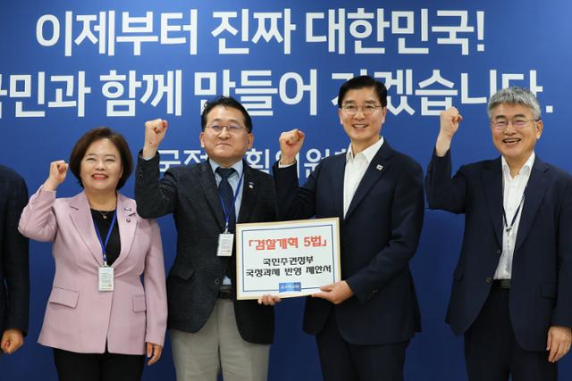 차규근 조국혁신당 최고위원이 11일 오전 서울 종로구 정부서울청사 창성동 별관 국정기획위원회에서 이해식 국정기획위원회 정치행정분과장에게 검찰개혁 5법 국민주권정부 국정과제 반영 제안서를 전달 후 참석자들과 기념촬영을 하고 있다. 뉴스1 |