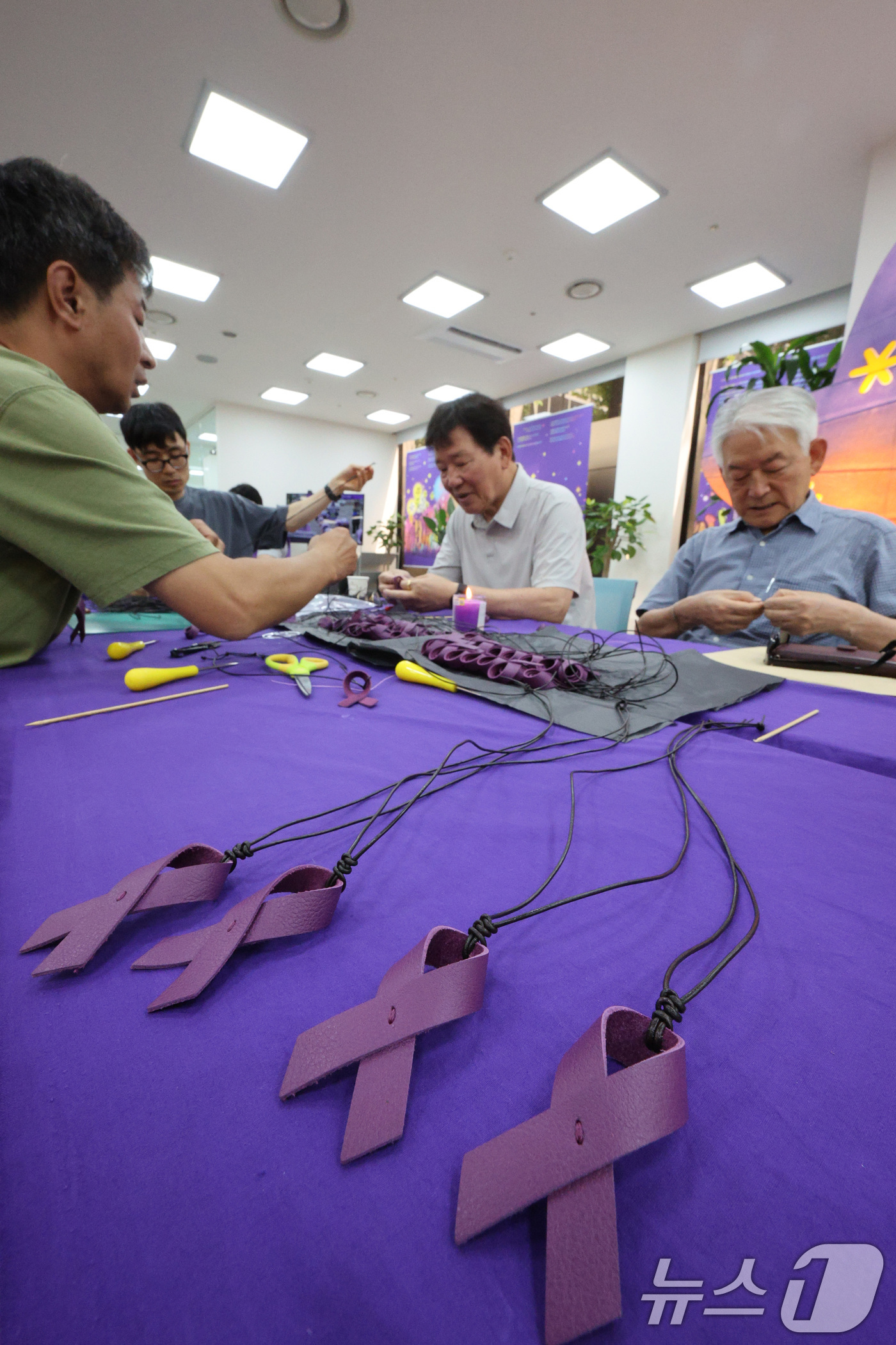 (서울=뉴스1) 신웅수 기자 = 12일 오후 이태원 참사 기억소통공간인 서울 종로구 별들의집에서 유가족을 비롯한 참가자들이 이태원 참사 발생 1000일을 추모하는 목걸이를 만들고 있다. 2025.7.12/뉴스1