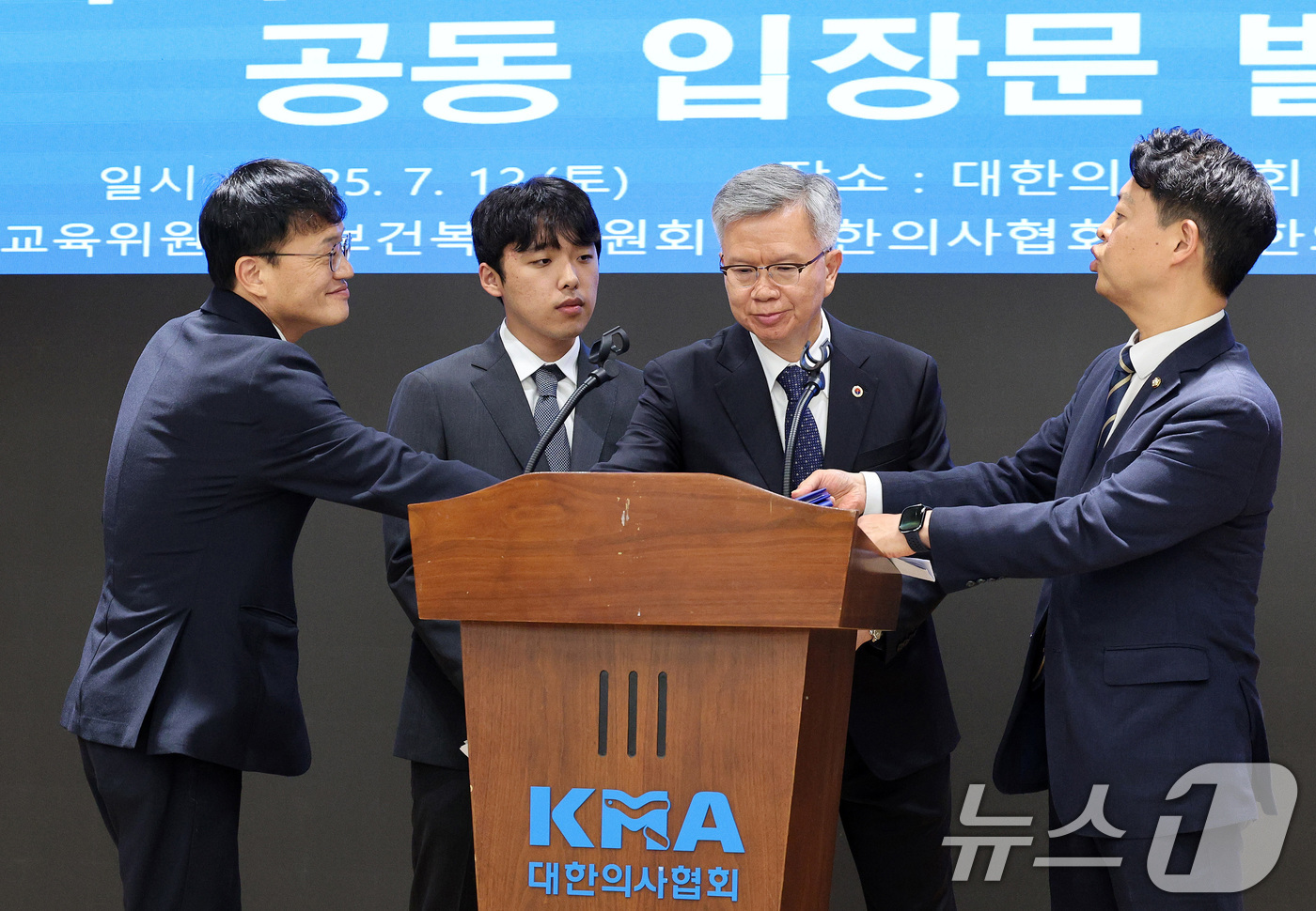 김영호 국회 교육위원장(왼쪽부터), 이선우 대한의과대학·의학전문대학원학생회 비상대책위원장, 김택우 대한의사협회장, 박주민 보건복지위원장이 12일 오후 서울 용산구 대한의사협회에서 의과대학 교육 정상화를 위한 공동 성명서를 발표하고 있다. 2025.7.12/뉴스1 ⓒ News1 신웅수 기자 |