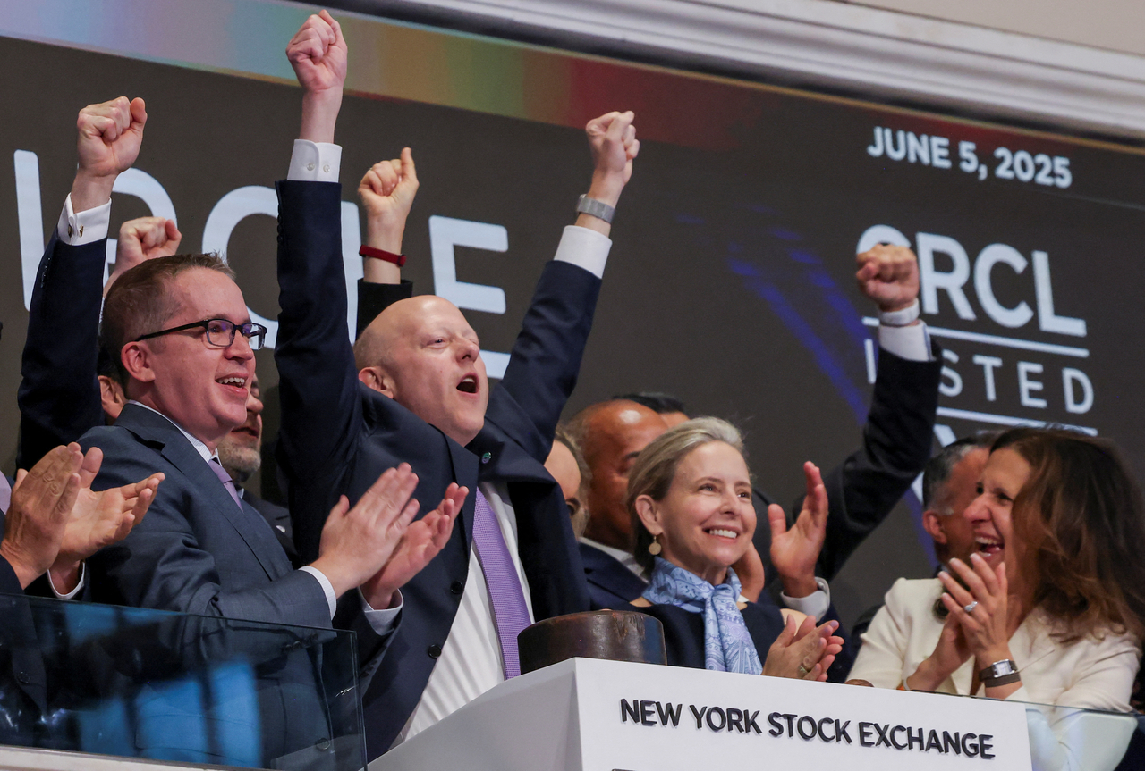 서클 인터넷 그룹의 CEO이자 공동 창립자인 제러미 알레어(앞줄 왼쪽에서 두번째)가 지난달 5일 회사 IPO 당일 오프닝 벨을 울리고 있는 모습. [로이터] |