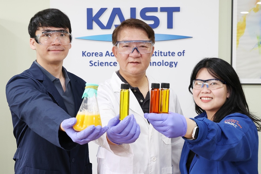 은현민(왼쪽부터) KAIST 박사과정,이상엽 특훈교수 신디 박사가 개발한 고효율 루테인 균주를 들어보이고 있다.[KAIST 제공] |