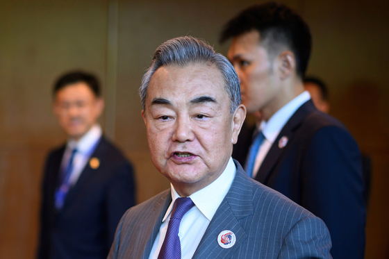 11일 왕이 중국 정치국위원 겸 외교부장이 말레이시아 쿠알라룸푸르에서 열린 제58차 아세안 외교장관회담장에 들어가며 기자에게 발언하고 있다. AP |