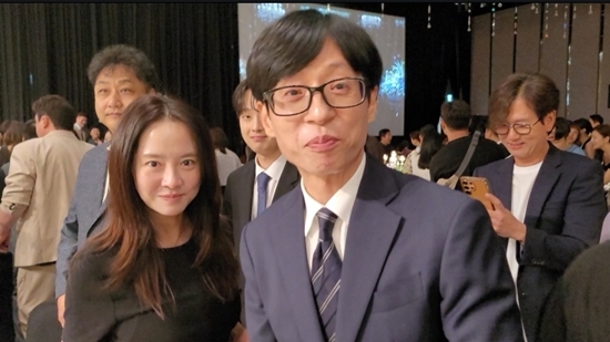 송지효는 블랙 드레스를 입고 유재석 옆에 조용히 섰다. 화려한 액세서리 하나 없이도 빛나던 존재감. 조명보다 먼저 시선을 사로잡은 건 그녀의 담백한 미소였다. 카메라를 향해 정면을 응시하던 모습은 마치 “지금 이 순간, 함께해줘서 고맙다”고 말하는 듯했다.