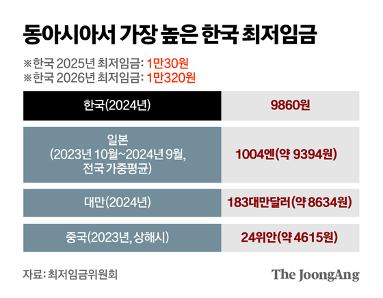 높은 최저임금은 소득 불평등 해소와 노동자 생활 안정에 긍정적으로 작용한다. 다만 인상 속도가 지나치게 빨랐다는 건 문제다. 2017년부터 2026년까지 누적 인상률이 60%에 육박한다. 일본의 지난해까지 10년간 누적 상승률이 28.7%(연평균 2.56%)에 불과한 것과 대조된다. 문재인 정부 때 최저임금을 가파르게 올린 탓에 현재 수준 자체가 아시아 최고 수준으로 높아진 것이다.