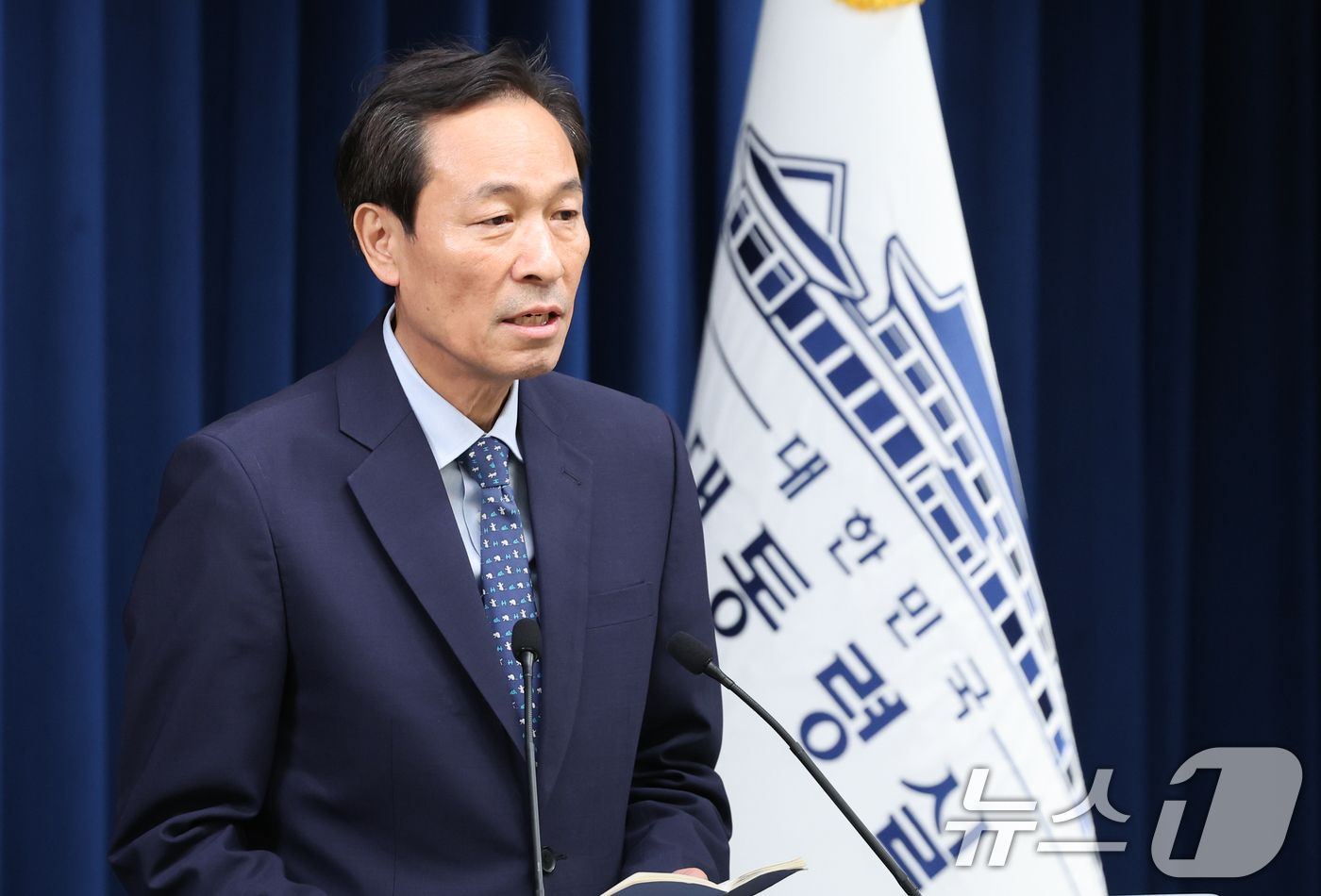 우상호 정무수석이 7일 서울 용산구 대통령실 청사에서 국무총리 오찬 주례 회동 관련 브리핑을 하고 있다. 2025.7.7/뉴스1 ⓒ News1 허경 기자 |