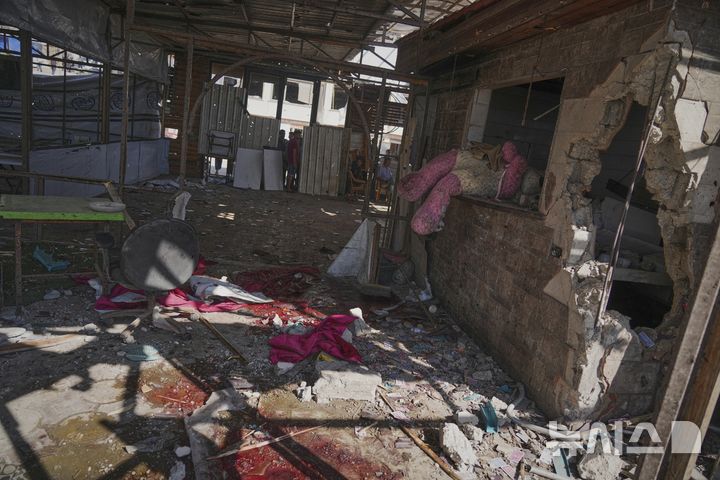 [가자시티=AP/뉴시스] 가자지구 가자시티 항구 인근에서 6월 30일 이스라엘군의 공격을 받은 한 카페 내부에 핏자국과 대형 인형이 흩어져 있다. 이 공격으로 여성과 어린이 포함 약 30명이 숨졌다. 이스라엘은 가자 시티에 '인도주의 도시'를 건설한다며 대규모 주민 이주를 예고했다. 2025.07.14. |