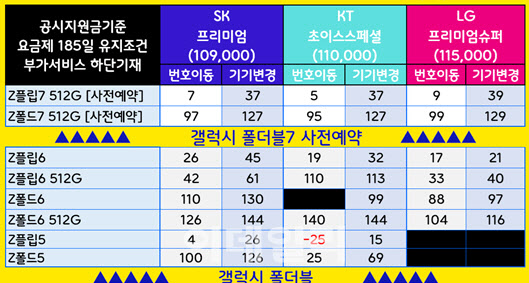 14일 일부 성지점의 내부 자료에 따르면, 갤럭시 Z폴드7 512GB 모델의 경우 KT 번호이동 시 95만원, SKT 번호이동 시 97만원, LG유플러스 번호 이동시 99만원에 사전예약한다고 돼있다. 다만 이같은 공시지원금을 받기 위해서는 10만원대 부가서비스를 185일을 유지하는 조건이다.