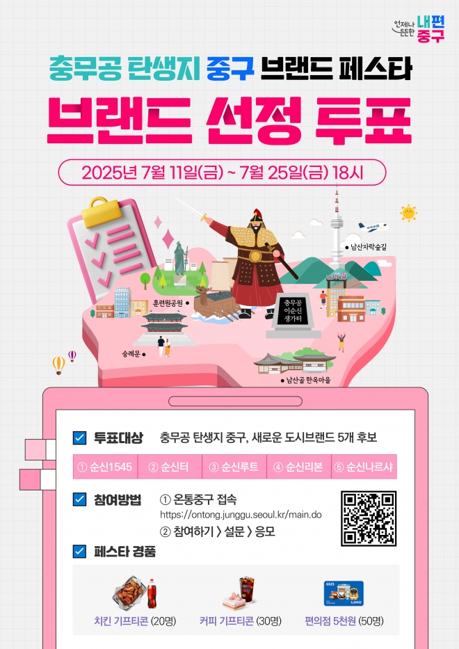 이번 투표는 온통중구 홈페이지를 통해 누구나 참여할 수 있다. 투표 결과(80%)와 전문가 심사 점수(20%)를 합산해 최종 브랜드 이름이 선정된다. 중구는 오는 10월 ‘제1회 이순신 축제’(가칭)에서 새로운 도시 브랜드를 공식 선포한다.