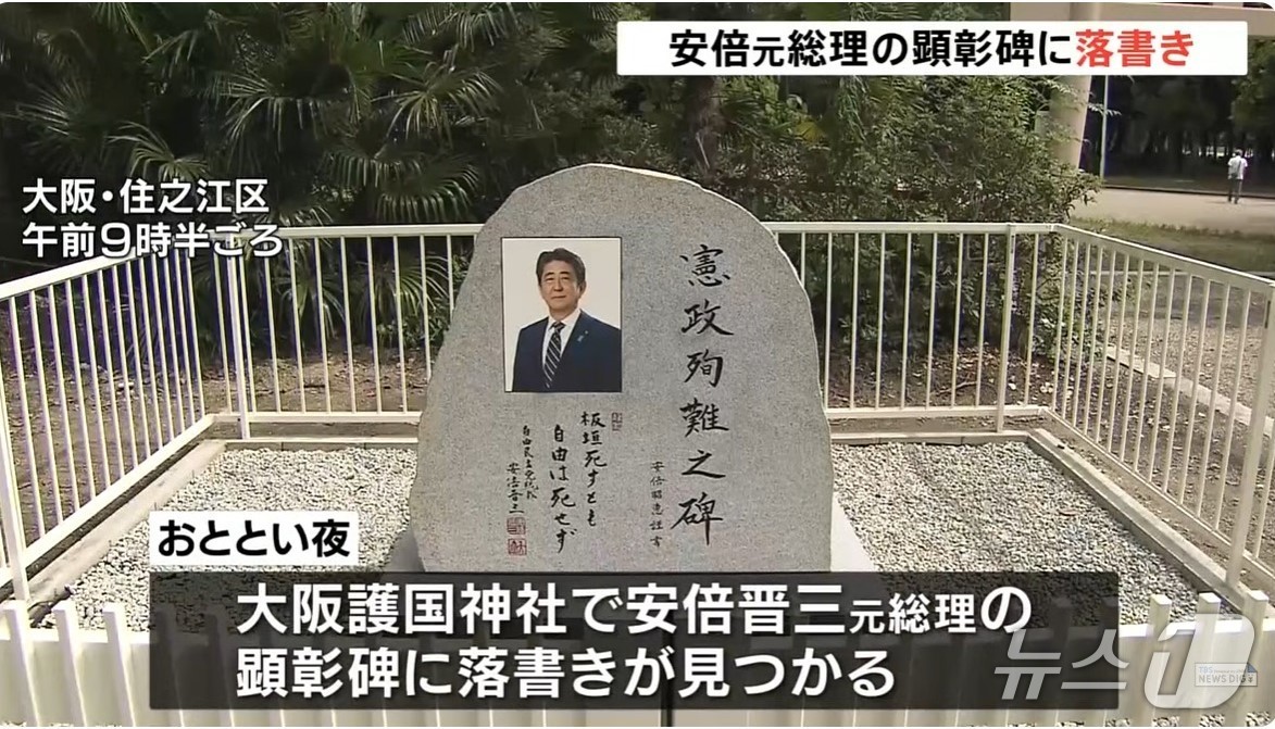 일본 오사카시 스미노에구 소재 고코쿠신사에 있는 아베 신조 전 총리의 기념비. TBS 뉴스 화면 캡처 |