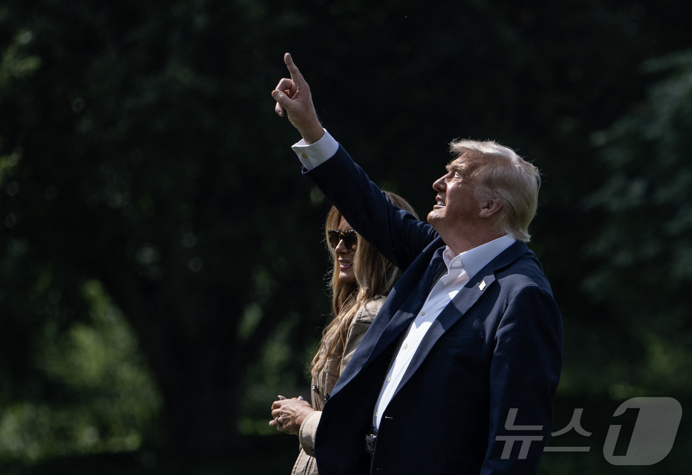 도널드 트럼프 미국 대통령이 11일(현지시간) 워싱턴DC에서 영부인 멜라니아 트럼프와 함께 '마린 원'(미 대통령 전용헬기)에 탑승하기 위해 걸어가면서 백악관 남쪽 잔디밭의 새 성조기를 가리키고 있다. 2025.07.11 ⓒ AFP=뉴스1 ⓒ News1 류정민 특파원 |
