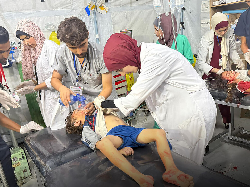 12일(현지시각) 가자지구 남부에서 이스라엘군의 공습으로 다친 아이가 쿠웨이트 특수야전병원 의료진이 치료하고 있다. 라파흐/UPI 연합뉴스 |