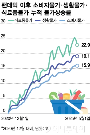 문제는 생활물가다. 한은에 따르면 인플레이션이 본격화된 2021년 이후 올해 5월까지 생활물가의 누적 상승률은 19.1%다. 소비자물가 누적 상승률(15.9%)보다 3.2%포인트(p) 높다. 같은 기간 식료품 물가 상승률은 22.9%를 기록했다.