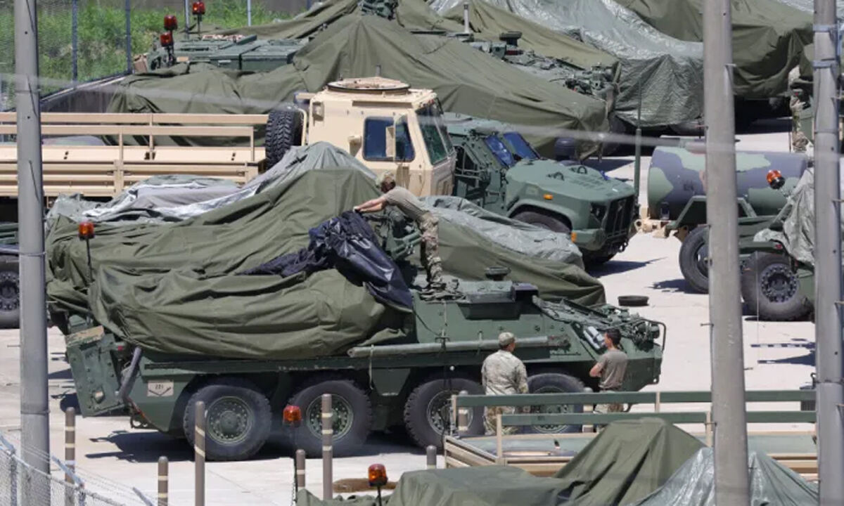 경기 동두천시 주한미군 기지에서 미군 스트라이커 장갑차가 대기하고 있다. 연합뉴스 |