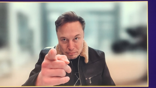 일론 머스크 최고 경영자(CEO)가 지난 5월 카타르 경제포럼 영상 대담에 참여해 카메라를 가리키고 있는 모습. [AFP 연합뉴스] |