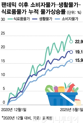팬데믹 이후 소비자물가·생활물가·식료품물가 누적 물가상승률/그래픽=김다나 |