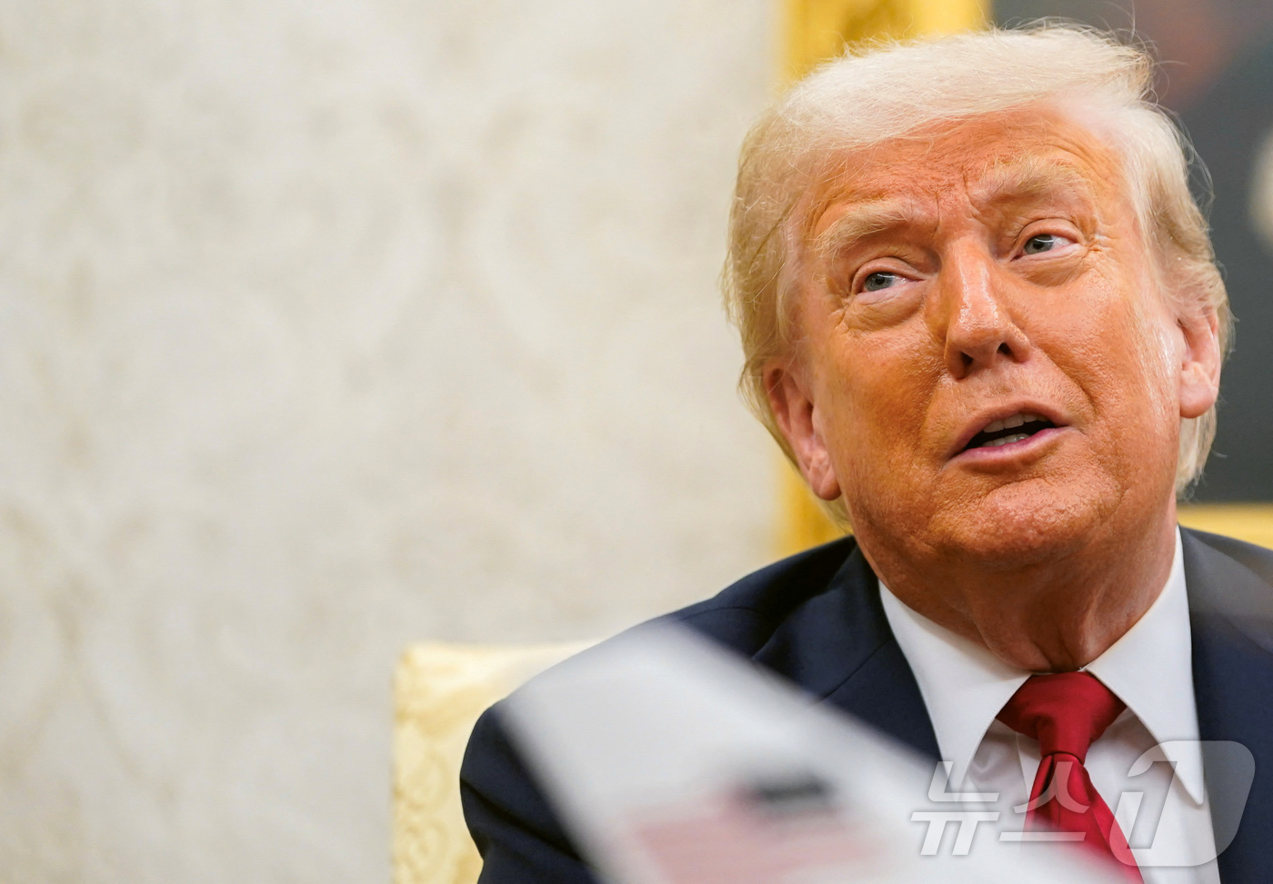 (워싱턴DC 로이터=뉴스1) 류정민 특파원 = 도널드 트럼프 미국 대통령 14일(현지시간) 워싱턴DC 백악관 오벌오피스에서 마르크 뤼테 북대서양조약기구(NATO, 나토) 사무총장과 만나 발언하고 있다. 트럼프는 이날 나토 유럽 국가가 우크라이나 지원을 위한 무기 구입 비용을 전액 부담할 것이라고 밝혔다. 2025.07.14 ⓒ 로이터=뉴스1