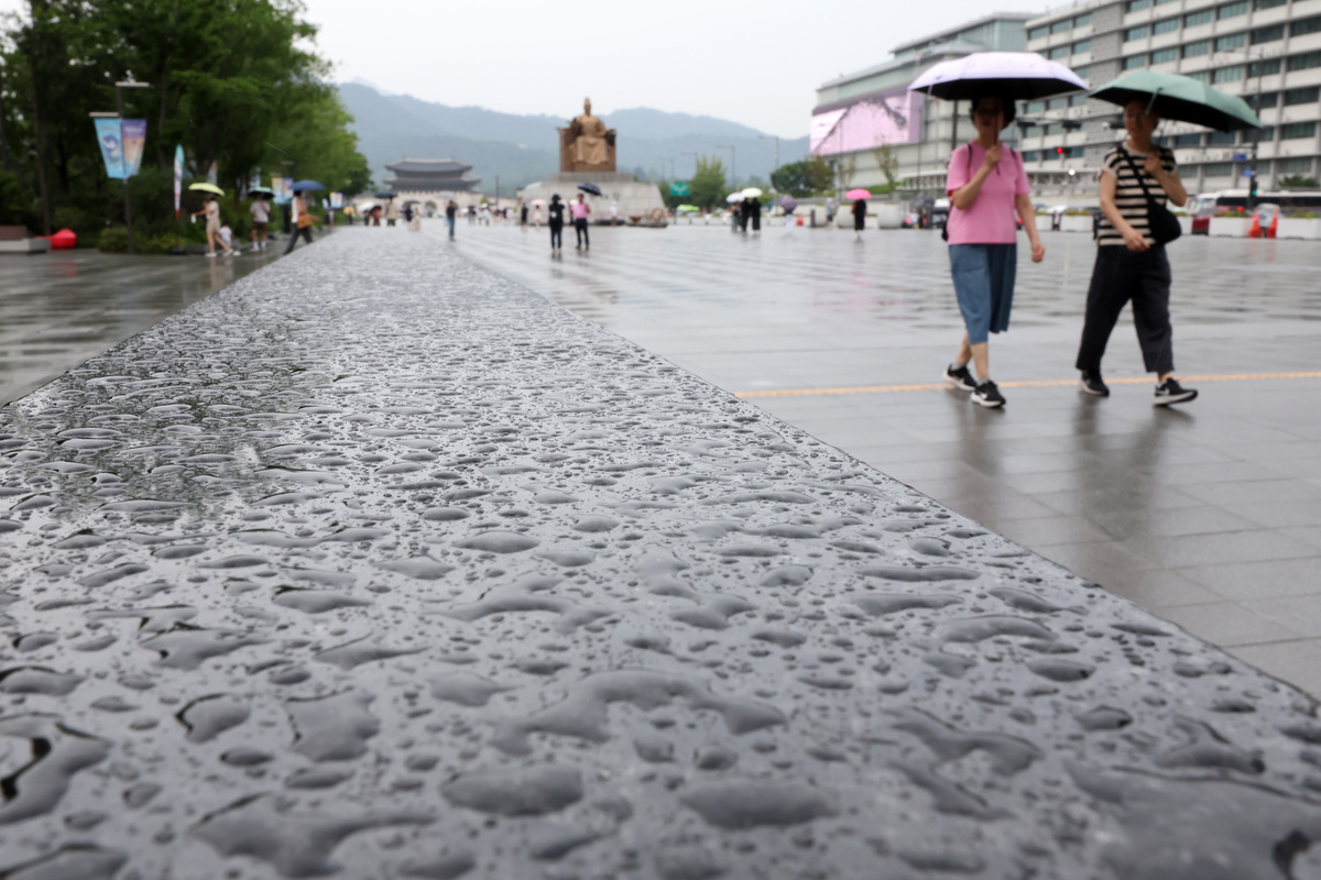 지난 13일 서울 종로구 광화문광장에서 우산을 쓴 시민들이 발걸음을 옮기고 있다. 뉴시스 |