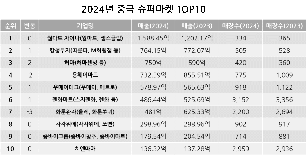 2023년과 비교했을 때, TOP10 안의 기업 구성 자체는 동일했지만 순위는 크게 바뀌었다. 허마가 4위에서 3위로 상승한 반면 용훼이(永辉)는 2위에서 4위로, 화룬완자(华润万家)는 4위에서 7위로 하락했다. 이와 반대로 롄화마트(联华超市)와 우메이(物美)는 각 1단계씩 상승했다.