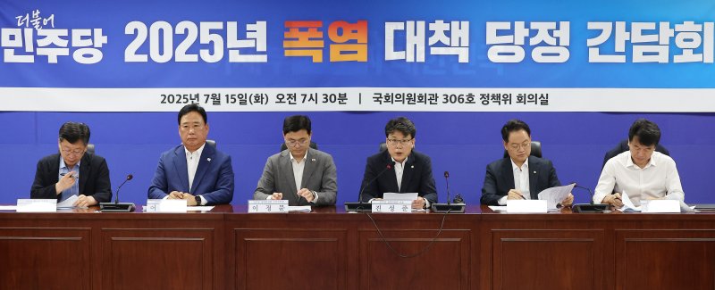 더불어민주당 진성준 정책위의장(왼쪽 네번째)이 15일 서울 여의도 국회 의원회관에서 열린 '폭염 대책 당정 간담회'에 참석해 발언하고 있다. 연합뉴스 |