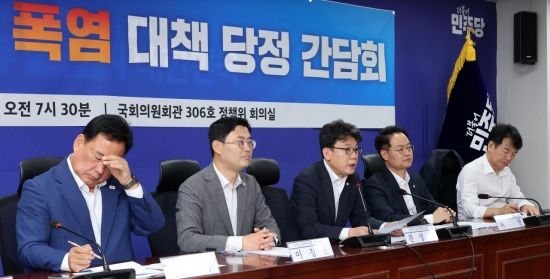 산업계 폭염 안전 대책도 논의됐다. 국회 환경노동위원회 민주당 간사를 맡은 김주영 의원은 "당정은 폭염 작업 시 2시간마다 20분 이상 휴식하는 개정된 산업안전보건규칙을 7월17일부터 시행한다"고 소개했다. 아울러 폭염 안전 대책반도 꾸려진다. 김 의원은 "고위험 사업장을 대상으로 개정된 산업안전보건규칙 5대 수칙(시원한 물·냉방장치·2시간마다 20분 휴식·보랭 장구 지급·온열질환 시 119 신고)을 지원하고 불시 점검도 실시하겠다"고 밝혔다.