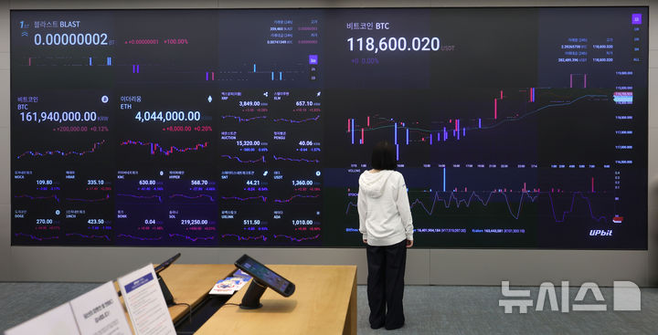 [서울=뉴시스] 김선웅 기자 = 가상화폐 비트코인 가격이 최고가를 경신하며 12만 달러에 육박했다. 13일 미국 동부시간 기준 오전 11시 22분 기준 미국 가상화폐 거래소 코인베이스에서 비트코인은 24시간 전보다 1.37% 오른 11만9049달러에 거래됐다.14일 오전 9시 30분 기준 가상화폐 거래소 업비트에서 비트코인은 1억6200만원대에 거래되고 있다. 이날 서울 강남구 업비트 고객센터 내 전광판에서 비트코인 시황이 표시되고 있다. 2025.07.14. mangusta@newsis.com |