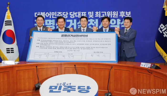 [서울=뉴스핌] 윤창빈 기자 = 정청래·박찬대 더불어민주당 대표 후보, 황명선 최고위원 후보가 15일 오전 서울 여의도 국회에서 열린 공명선거실천서약식에서 서약서에 서명을 마치고 기념촬영을 하고 있다. 왼쪽부터 김병기 당대표 직무대행 겸 원내대표, 정 후보, 박 후보, 황 후보, 김정호 중앙당 선거관리위원장. 2025.07.15 pangbin@newspim.com