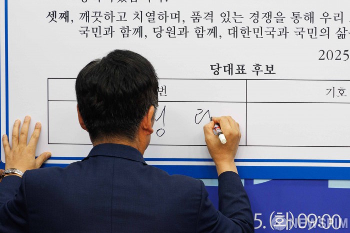 [서울=뉴스핌] 윤창빈 기자 = 정청래 더불어민주당 대표 후보가 15일 오전 서울 여의도 국회에서 열린 공명선거실천서약식에서 서약서에 서명을 하고 있다. 2025.07.15 pangbin@newspim.com