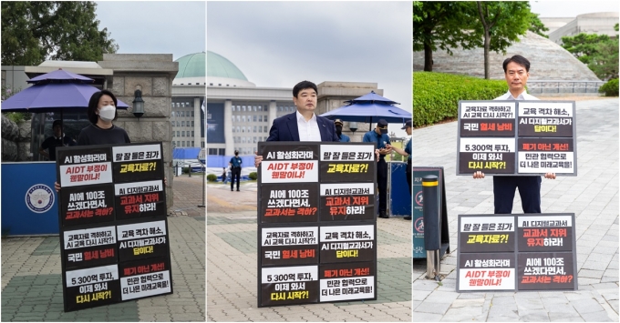 AI 디지털교과서(AIDT)의 법적 지위를 '교과서'에서 '교육자료'로 낮추는 초중등교육법 개정안이 최근 국회 상임위원회를 통과한 가운데, AIDT 발행사와 교과서발전위원회 관계자들은 전날부터 국회와 용산 대통령실 앞에서 릴레이 시위에 나섰다고 15일 밝혔다. 시위에는 교과서발전위원회를 비롯해 천재교과서 외 주요 발행사 관계자들이 공동으로 참여한다.