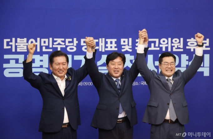 민주당은 15일 오전 서울 여의도 국회 본관에서 '민주당 당대표 및 최고위원 후보 공명선거실천서약식'을 개최했다. 이 자리에는 당대표 선거에 출마한 정청래·박찬대 의원과 민주당 최고위원 선거에 단독 출마한 황명선 의원이 자리했다.