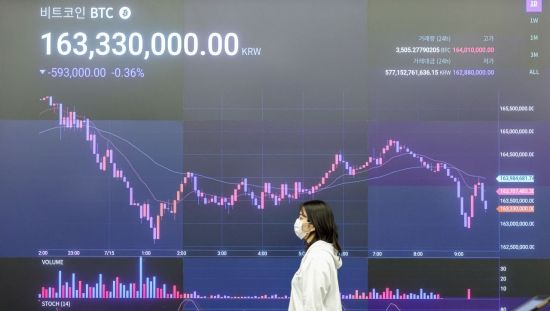 비트코인이 사상 최고가인 12만달러(약 1억6545만원)를 돌파하며 강세를 이어가고 있는 가운데 15일 서울 강남구 업비트 고객센터 전광판에 비트코인 시세가 표시돼 있다.