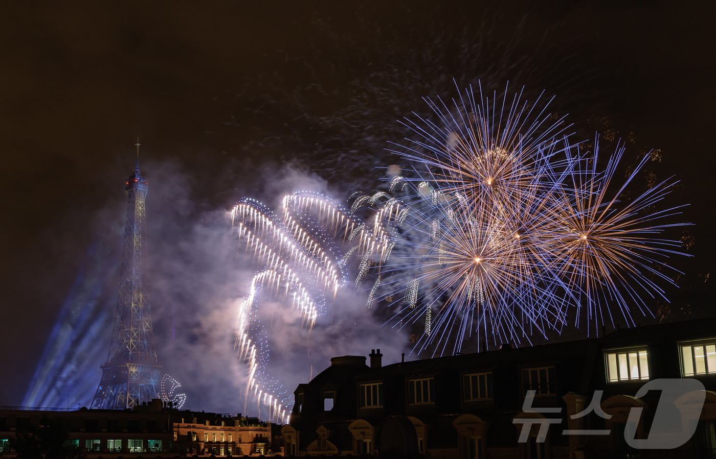(파리=뉴스1) 이준성 기자 = 14일(현지시간) 프랑스 혁명 기념일(바스티유 데이)을 기념하기 위해 에펠탑에 펼쳐진 불꽃놀이 쇼에서 1천100대의 드론이 불꽃과 함께 빛의 향연을 펼치고 있다. 2024.7.15/뉴스1
