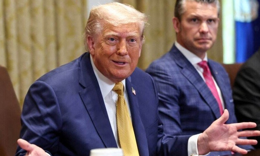 8일(현지시각) 미국 워싱턴 백악관에서 열린 내각 회의에서 도널드 트럼프 미국 대통령(왼쪽)이 발언하고 있고 피트 헤그세스 국방장관(가운데), 하워드 러트닉 상무장관(오른쪽)이 옆자리에 앉아 있다. 워싱턴/로이터 연합뉴스 |