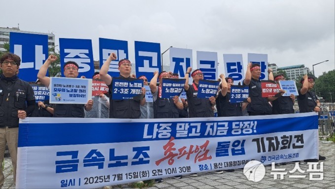 [서울=뉴스핌] 조승진 기자 = 15일 전국금속노동조합(금속노조)은 서울 용산 대통령 집무실 앞에서 기자회견을 열고 오는 16일 7만여명 규모로 총파업에 돌입한다고 밝혔다. 2025.07.15 chogiza@newspim.com |