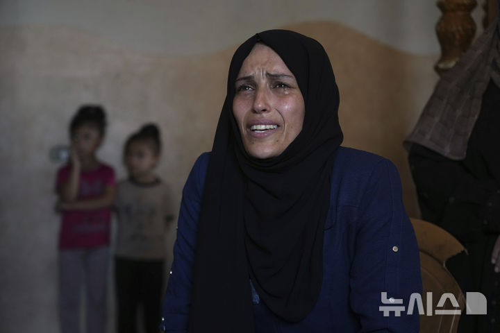 [데이르알발라=AP/뉴시스] 가자지구 데이르 알발라에 위치한 자택에서 인터뷰 도중 감정을 드러내는 이만 알누리. 그녀는 배급을 받기 위해 기다리던 중 이스라엘의 공습으로 두 자녀를 잃었다. 2025.07.12. |