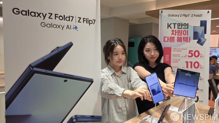 [서울=뉴스핌] 양윤모 기자 = 삼성전자의 새로운 폴더블폰 '갤럭시 Z7' 시리즈가 공식 출시를 앞두고 15일부터 일주일간 예약 판매를 시작한 가운데, KT 광화문 중앙점을 찾은 소비자들이 'Z 폴드7·Z 플립7'을 살펴보고 있다. 2025.07.15 yym58@newspim.com