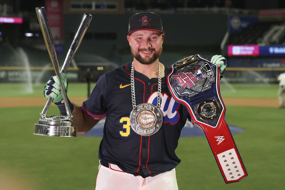 MLB 올스타전 홈런 더비 우승자 칼 랄리가 트로피와 챔피언벨트를 들고 활짝 웃고 있다. 로이터=연합뉴스 |