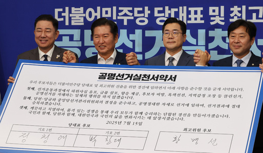 더불어민주당 당대표 선거에 출마한 정청래(왼쪽 두 번째), 박찬대 후보(〃 세 번째)가 15일 국회에서 열린 공명선거실천서약식에서 서약을 마친 뒤 김병기 원내대표(맨 왼쪽), 황명선 최고위원 후보자와 함께 기념촬영을 하고 있다.