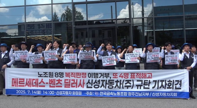 금속노조 광주전남지부 신성자동차지회가 지난 14일 광주 서구 화정동 신성자동차 전시장 앞에서 기자회견을 열고 해고자 원직복직을 촉구하고 있다. [사진=금속광전 유튜브 갈무리] 2025.07.15 hkl8123@newspim.com |
