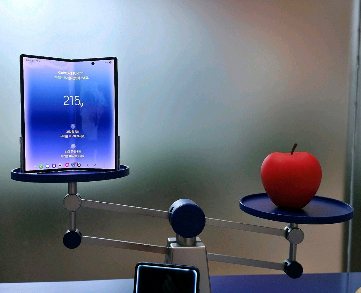 “더 얇게 더 가볍게” 이동통신 3사가 갤럭시 Z 폴드7과 Z 플립7의 사전예약을 받기 시작한 15일 서울 마포구 삼성스토어 홍대에 갤럭시 Z폴드가 전시돼 있다. 삼성전자 제공 |