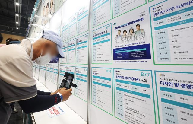 지난 9일 경기도 수원시 권선구 수원메쎄에서 열린 '경기도 5070 일자리 박람회'에서 구직자들이 채용정보 게시판을 살펴보고 있다. [사진=연합뉴스] |