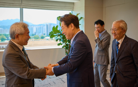 이재명 대통령이 지난 11일 서울 용산 대통령실에서 정규재 전 한국경제 주필과 조갑제 조갑제닷검 대표와 오찬 회동을 하고 있다. 사진=대통령실 |