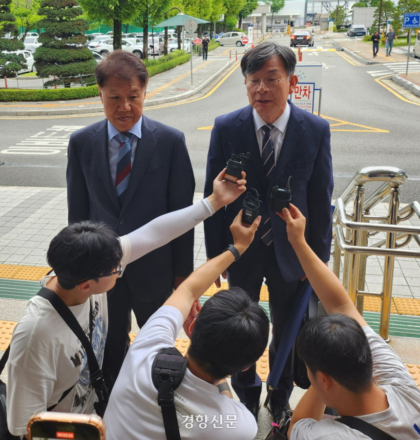 김수현(왼쪽)·김상조 전 청와대 정책실장이 16일 대전지법 앞에서 통계조작 의혹 사건에 대한 입장을 밝히고 있다. 강정의 기자 |