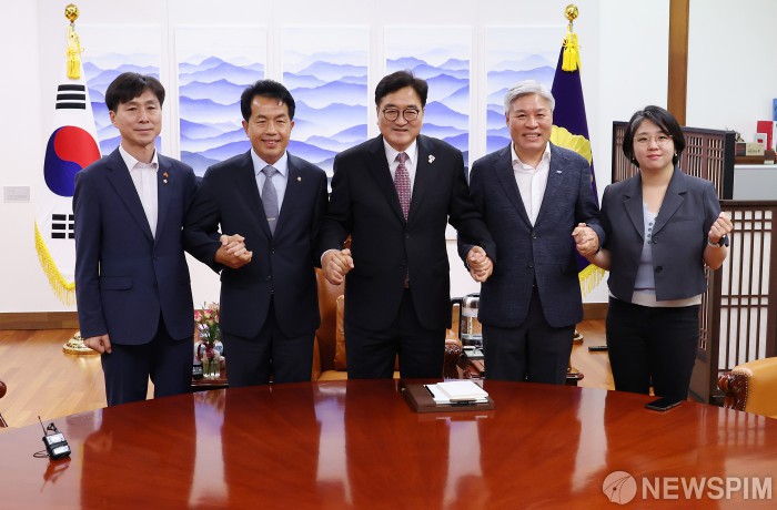 [서울=뉴스핌] 정일구 기자 = 우원식 국회의장이 16일 오후 서울 여의도 국회에서 비교섭단체 야4당 원내대표 면담에 앞서 기념촬영을 하고 있다. 왼쪽부터 한창민 사회민주당 대표, 윤종오 진보당 원내대표, 우 의장, 서왕진 조국혁신당 원내대표, 용혜인 기본소득당 대표. 2025.07.16 mironj19@newspim.com