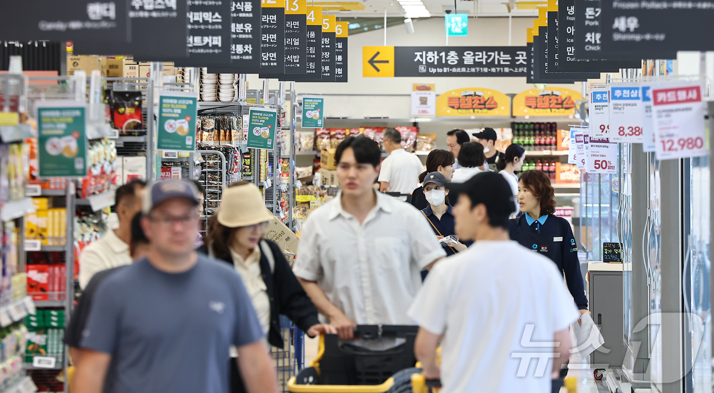 (서울=뉴스1) 김도우 기자 = 최근 한국의 소비심리가 주요국 가운데 가장 빠르게 회복된 것으로 나타났다. 16일 경제협력개발기구(OECD)의 소비자 바로미터(Consumer Barometer)에 따르면, 지난달 한국은 0.81을 기록하며 통계를 확인할 수 있는 33개국 중 가장 높은 수치를 보였다. 이는 미국(0.68)과 일본(0.32) 등 주요국을 모두 앞선 수치다. 사진은 이날 서울 시내 대형마트에서 시민들이 장을 보는 모습. 2025.7.16/뉴스1
