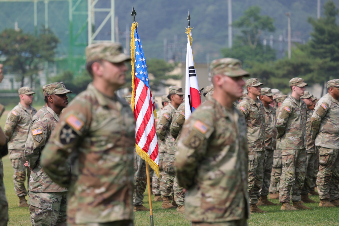 지난달 18일 경기 동두천시 캠프 케이시에서 열린 주한미군 순환배치 여단 임무교대식에서 태극기와 성조기가 나란히 놓여 있다. 연합뉴스 |