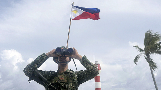 지난달 5일 필리핀이 점유하고 있는 남중국해 웨스트요크섬에 필리핀 국기가 걸려있는 가운데 필리핀 해병대원이 경계 근무를 서고 있다. AP=연합뉴스 |