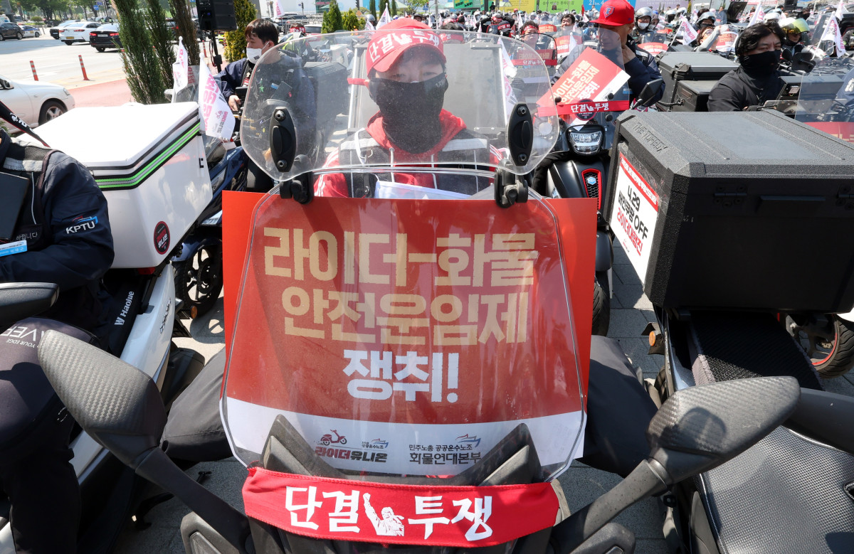 민주노총 공공운수노조 화물연대본부와 라이더유니온지부가 29일 오후 서울 송파구 배달의민족 본사 앞 올림픽공원에서 '안전운임제 쟁취 배민쿠팡 투쟁선포 라이더-화물 노동자 대행진'을 하고 있다. 2025.04.29. |