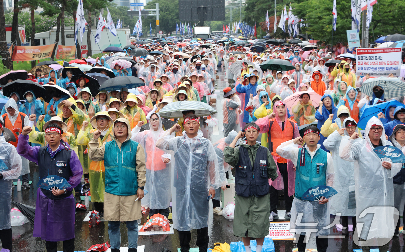 (서울=뉴스1) 김명섭 기자 = 16일 오후 서울 여의도 국회앞에서 열런 '노조법 2·3조 즉각개정! 윤석열정권반노동정책즉각폐기! 노정교섭쟁취! 민주노총총파업대회에서 양경수 민주노총위원장과 조합원들이 구호를 외치고 있다. 2025.7.16/뉴스1