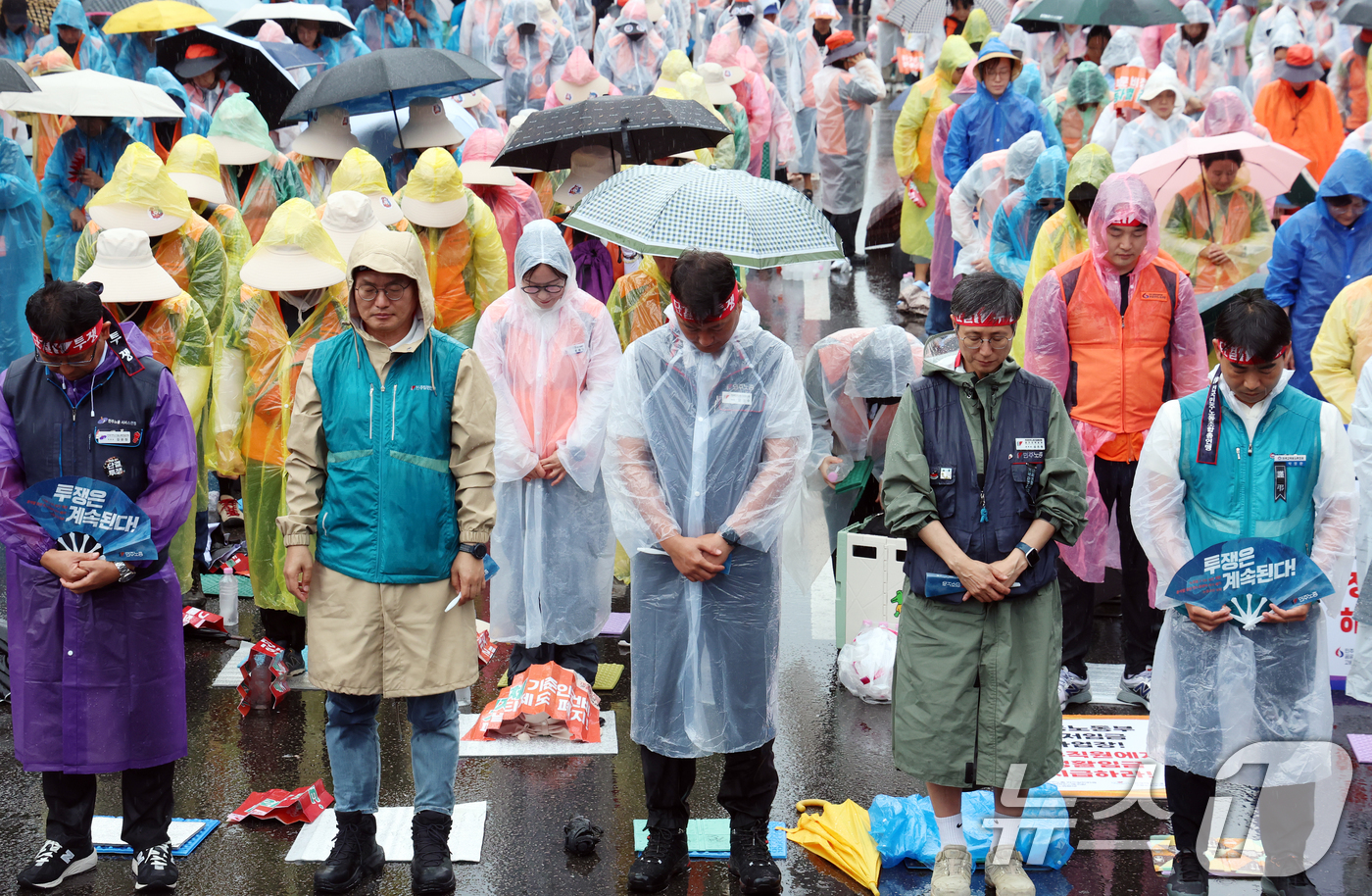 (서울=뉴스1) 김명섭 기자 = 16일 오후 서울 여의도 국회앞에서 열런 '노조법 2·3조 즉각개정! 윤석열정권반노동정책즉각폐기! 노정교섭쟁취! 민주노총총파업대회에서 양경수 민주노총위원장과 조합원들이 묵념을 하고 있다. 2025.7.16/뉴스1